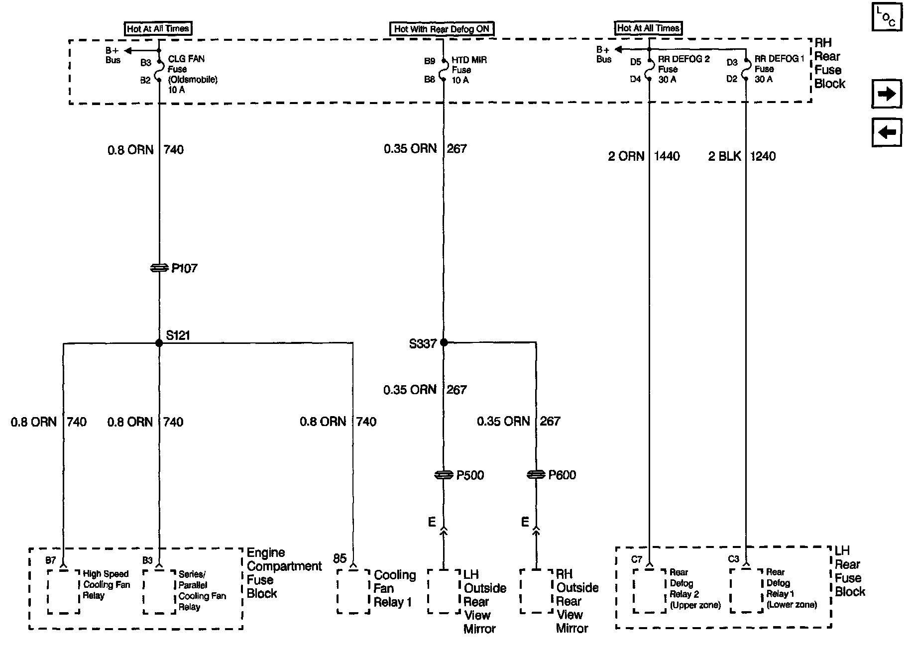 Power Distribution Schematics: CLG FAN Fuse, HTD MIR Fuse, RR DEFOG 1 Fuse, And RR DEFOG 2 Fuse: