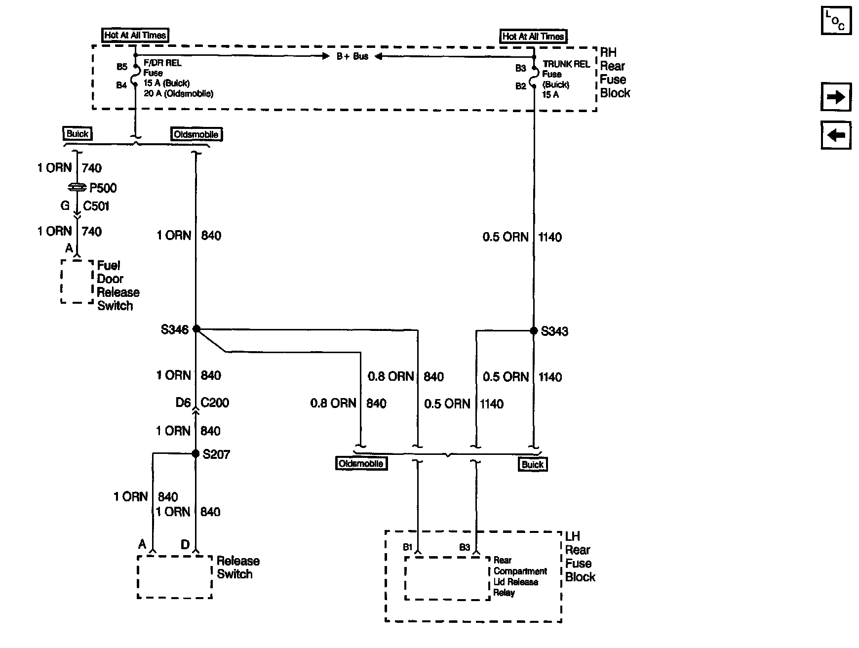Power Distribution Schematics: F/DR REL Fuse (Buick/Oldsmobile) And TRUNK REL Fuse (Buick):