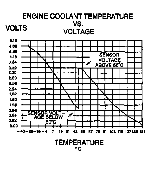 The ECT sensor circuit uses two different temperature sensing circuits for two temperature ranges - below 50°C (122°F) and above 50°C (122°F). The PCM will shift between a high resistance circuit for low temperatures and a low resistance circuit for high temperatures.