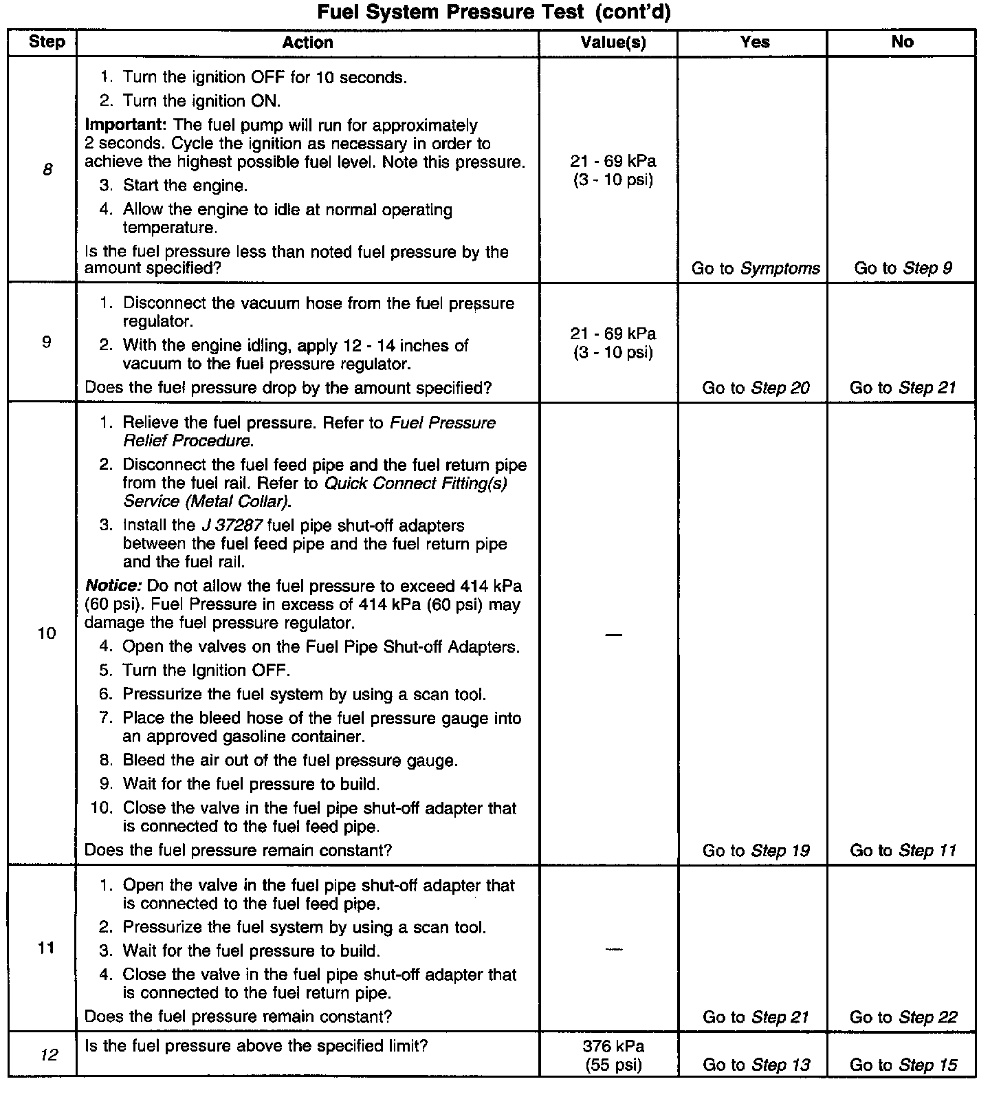 16. Restricting the fuel return pipe with the Fuel Pipe Shut-Off Adapter. Refer to J 37287 causes the fuel pressure to rise above the regulated fuel pressure. Using a scan tool to pressurize the system, the fuel pressure should rise above 376 kPa (55 psi) as the valve on the Fuel Pipe Shut-Off Adapter connected to the fuel return pipe becomes partially closed.