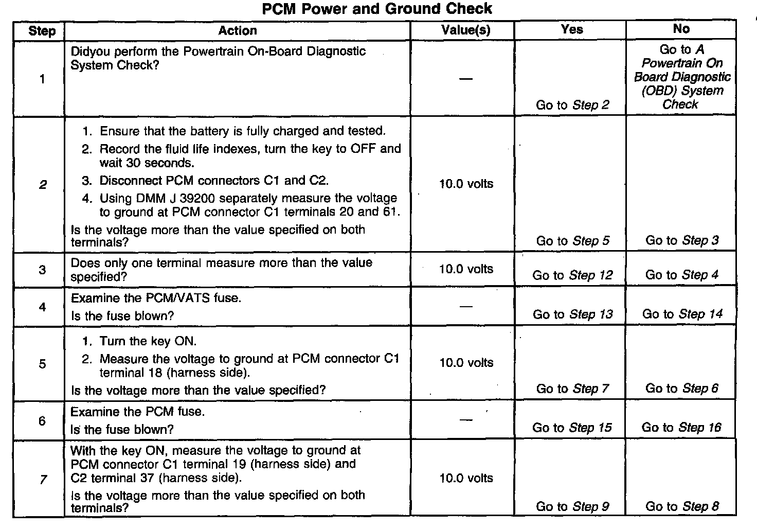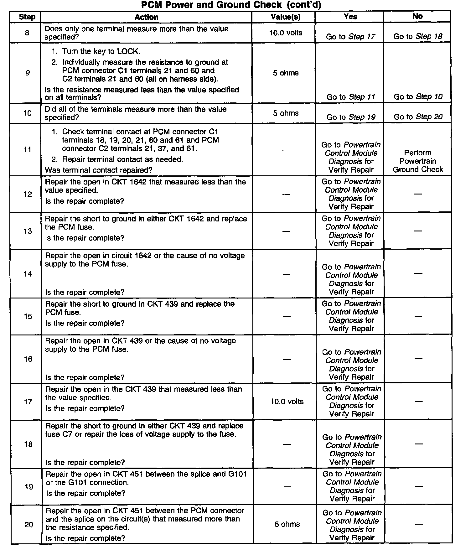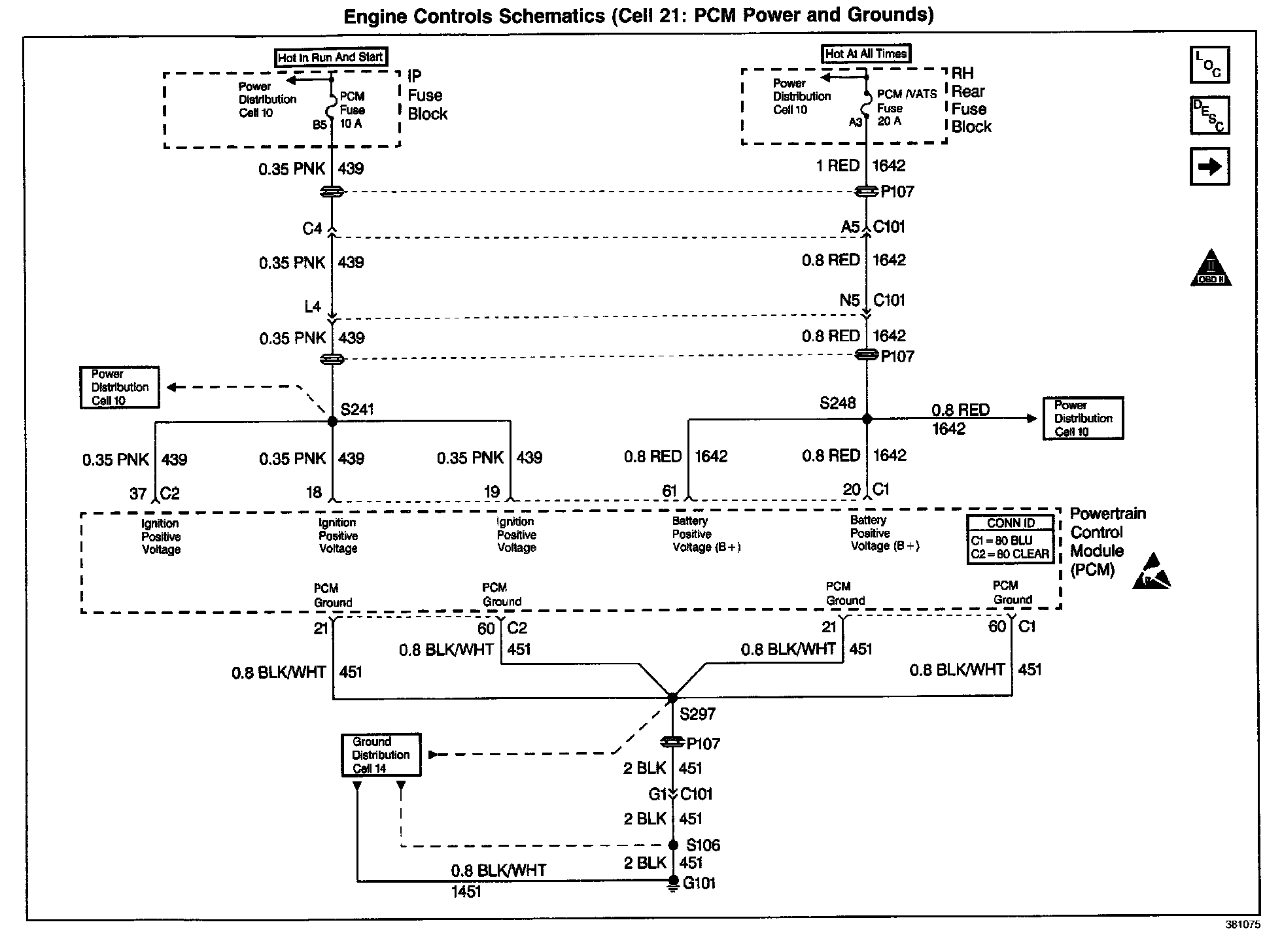The PCM is fed battery voltage at all times at PCM connector C1 terminals 20 and 61 through CKT 1642 from the 20 amp fuse. IGN 1 voltage, Hot in Run, Bulb Test or Start, is fed through CKT 439 and 10 amp fuse to PCM connector C1 terminals 18 and 19 and C2 terminal 37. The PCM needs all of these inputs to function properly. The PCM also has four grounding pins: at terminals 21 and 60 of both PCM connectors C1 and C2. These terminals are grounded through CKT 451 to ground G101.