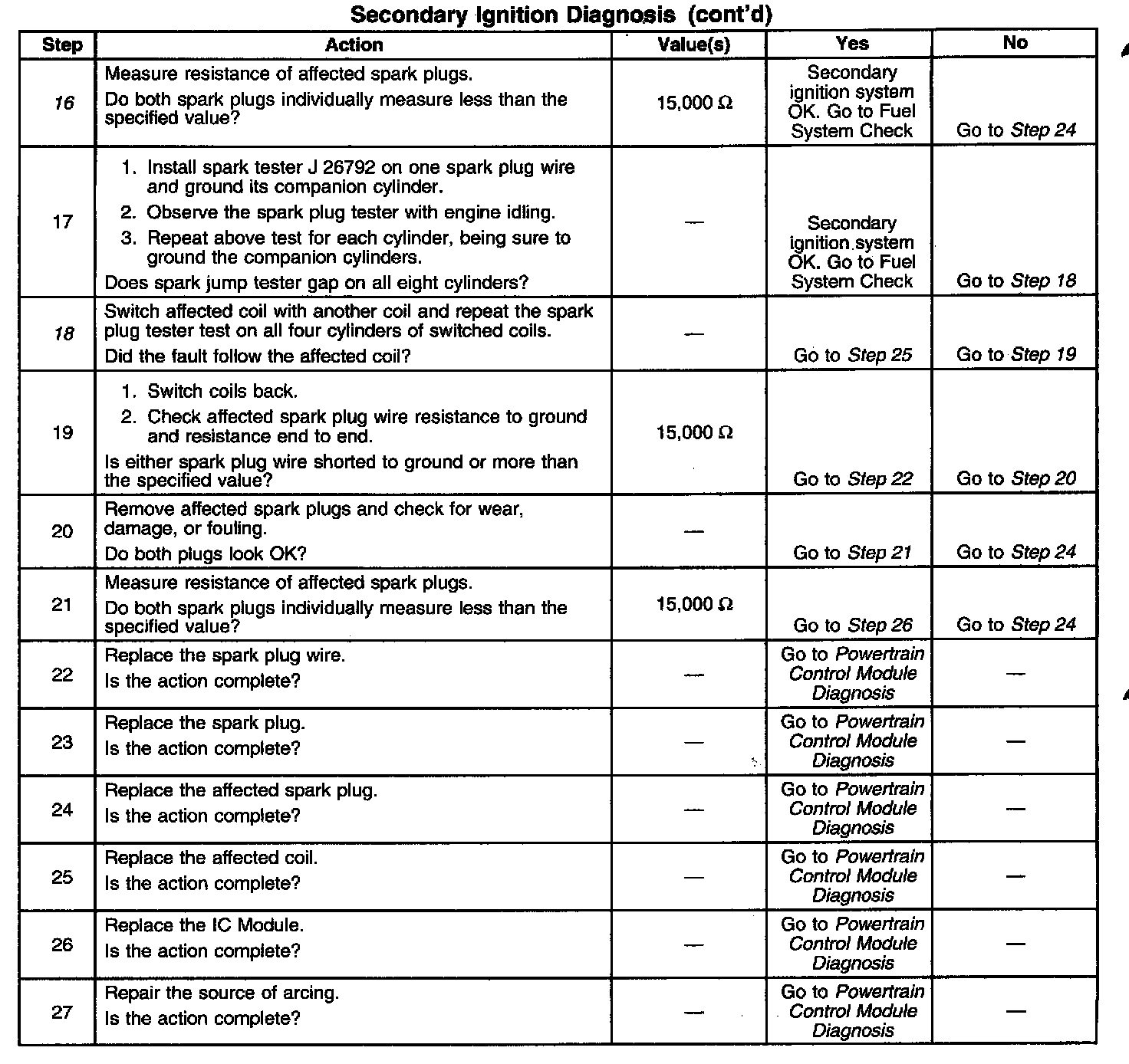 The Secondary Ignition Check tests for faulty spark plugs, plug wires, or IC Module/Coils. This table requires the J 26792 spark tester (ST 125).