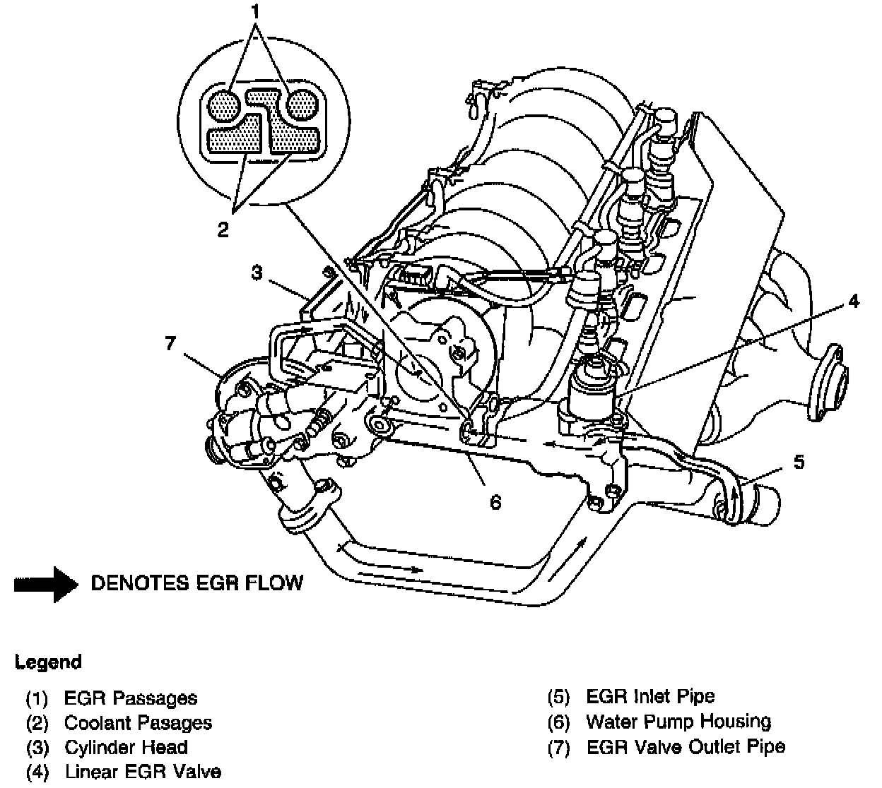 In the crossover water pump housing, as shown in the EGR Flow figure, exhaust gases are precisely metered by the PCM controlled EGR Valve, then cooled by engine coolant and finally routed into the throttle body spacer through another corrugated semi-flexible feed pipe from the water pump crossover. A potential drawback with EGR is that for certain driving schedules, deposits can accumulate when hot exhaust gases are cooled. The system uses the crossover water pump housing as a cross-flow heat exchanger to cool exhaust gases in large easily cleaned passages to virtually eliminate any concern with deposit accumulation during the service life of the engine. This is done by having the cooling passage reduce EGR gasses below their deposit forming temperature prior to routing these gasses into the throttle body spacer.