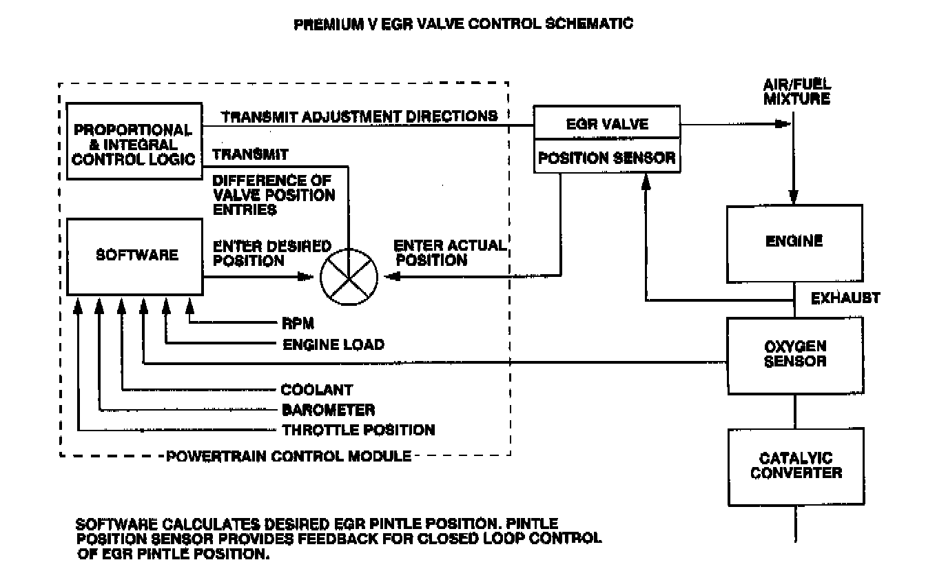 The Exhaust Gas Recirculation (EGR) System removes exhaust gas from the exhaust manifold and pipes it back to the combustion chambers, where it can be burned again. This helps to reduce oxides of nitrogen (NOx) emissions, by reducing combustion temperatures. The EGR valve meters the amount of exhaust gas that is allowed to return to the combustion chambers. The PCM controls the EGR valve, dictating when operation begins and ends, along with determining the amount of exhaust gas that can be efficiently recycled. The EGR valve consists of a solenoid, a pintle, and a pintle position sensor. By energizing the solenoid, the PCM causes the pintle to open and allows exhaust gas to pass through the valve. The solenoid is connected to ignition voltage. The PCM controls the solenoid by grounding the control circuit. By switching the ground on and off, the PCM creates a variable pulse width modulated (PWM) signal that opens the pintle at different rates and to different positions.