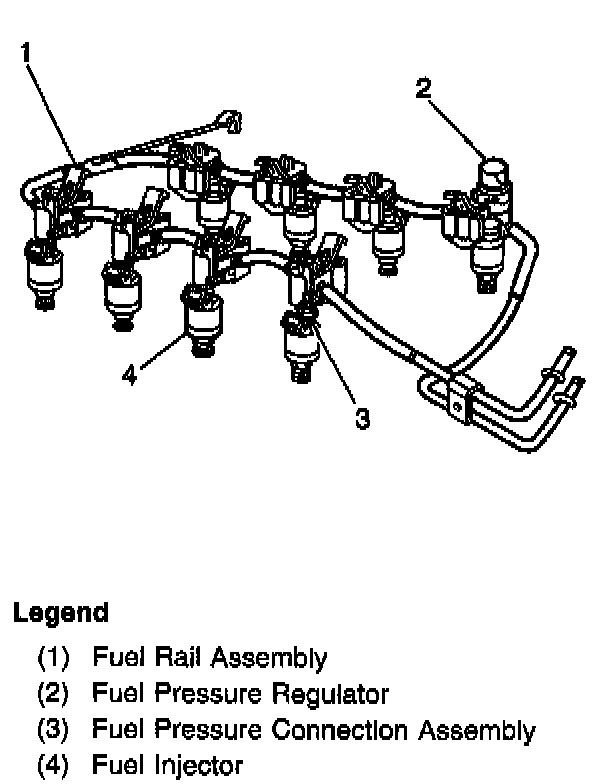 Fuel is delivered from the pump through the fuel feed pipe to the inlet port of the fuel rail pipe. From the fuel feed inlet, fuel is directed to the front rail pipe, then a crossover to the rear pipe, then through the rear rail pipe to the fuel pressure regulator. Fuel in excess of injector needs flows back through the pressure regulator assembly to the outlet port of the fuel rail. Fuel then flows through the fuel return pipe to the fuel tank to begin the cycle again.