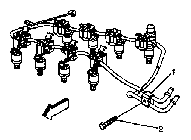 16. Install the fuel rail end-point bracket (1) retainer bolt (2).