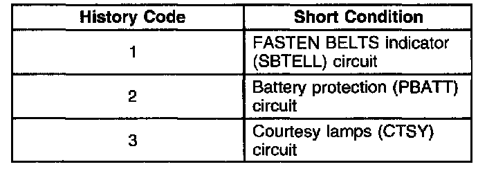 Upon entering the diagnostic mode, the MALL module provides audible feedback in the form of tones. The number of tones represents the stored history code number. The FASTEN BELTS indicator flashes with each tone. In the following chart, the history code is listed with the corresponding short circuit condition:Body Control Module Diagnostic Information:
