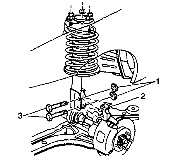 7. Remove the strut to knuckle bolts (3) and the nuts (1) in order to separate the strut from the steering knuckle (2).