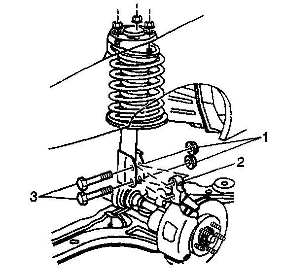 3. Install the strut to knuckle bolts (3) and nuts (2) aligning the strut and knuckle to the scribe marks made in the removal procedure.