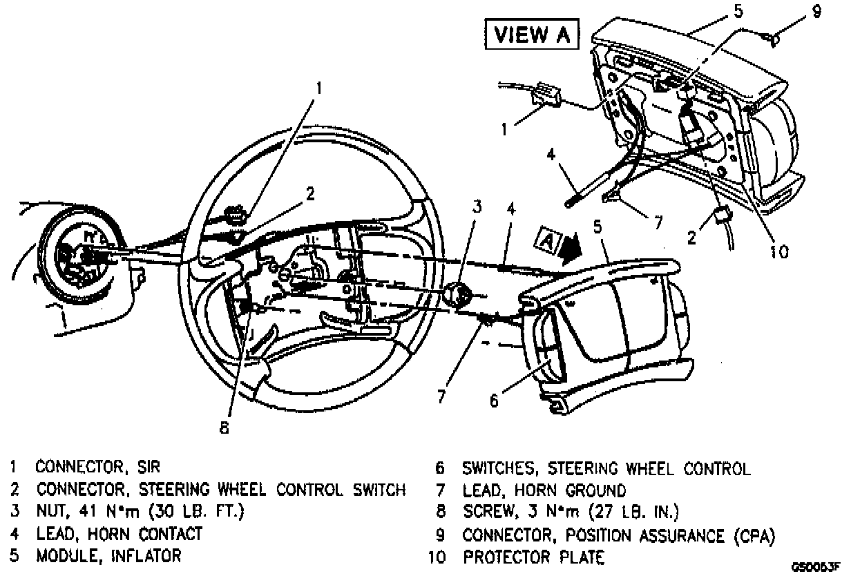 6. Inflator module to steering wheel. Install top surface of module first to ease assembly and fit. Do not pinch any wires.