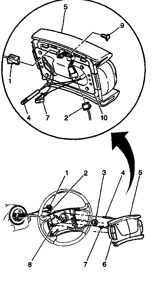1. Connect the horn ground lead (7) and the contact lead (4) to the inflator module (5).