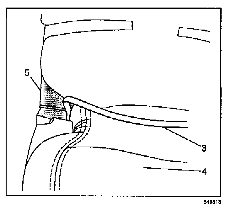 3. Insert the seat heat element harness (3) between the seat cushion (4) and the adjuster assembly (5).