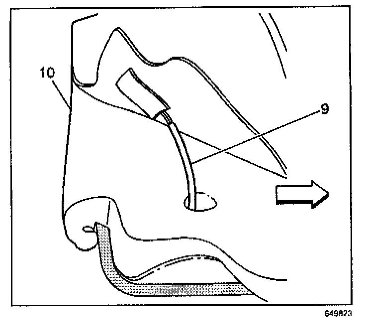 3. Insert the seat heat element harness (9) through a hole located in the right rear corner of the seat cushion pad (10).