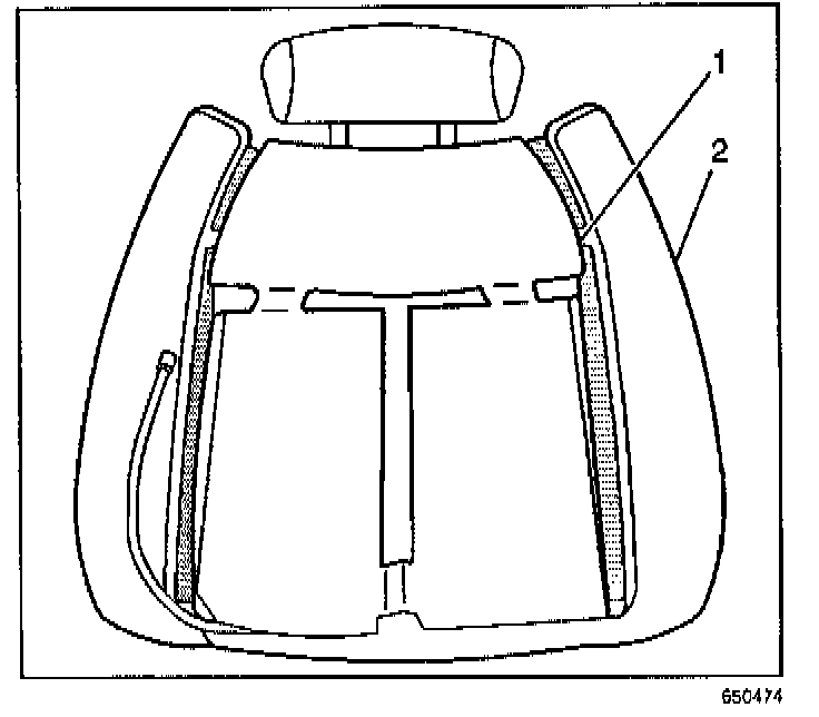 ^ Carefully position and press the heat element (1) onto the seat back cushion pad (2).