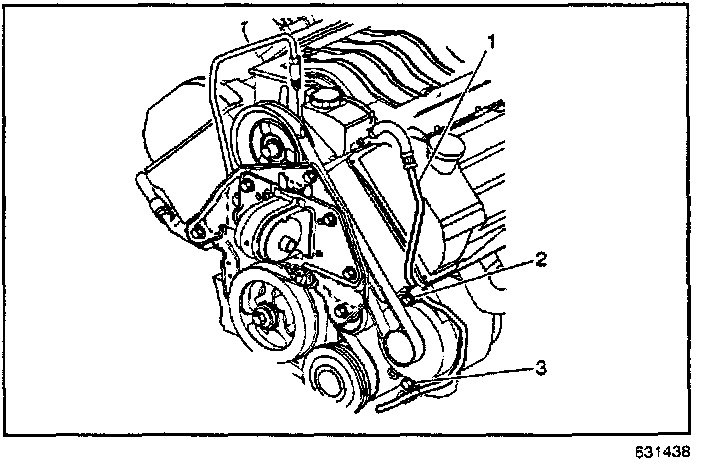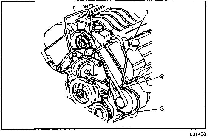 21. Tighten the nut (3) securing the power steering outlet hose to the lower generator frame attachment stud.
