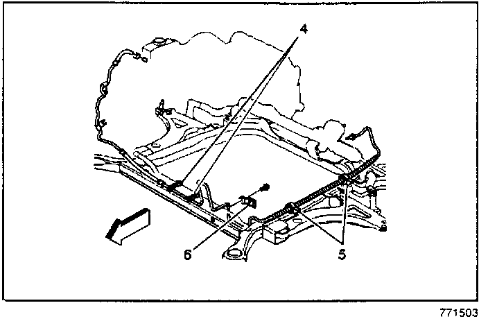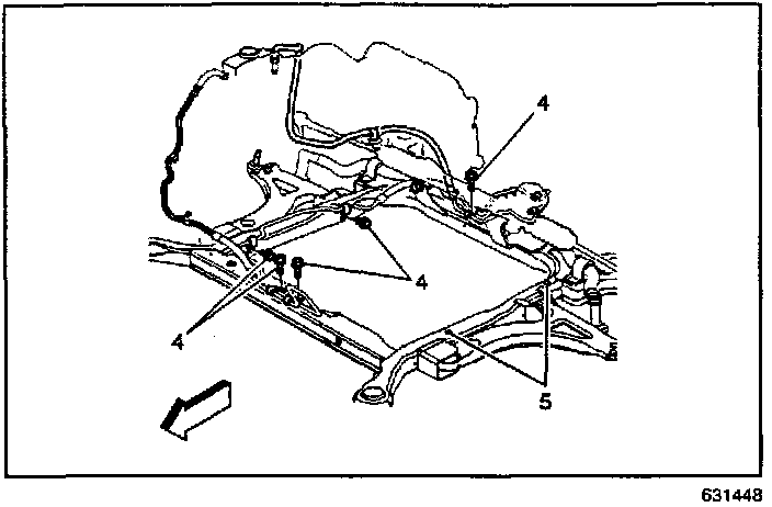 23. On 1995-1998 vehicles, position the two retaining clips (4) on the top surface of the front engine frame crossmember over the existing holes and fasten with two 10 mm bolt/screws.