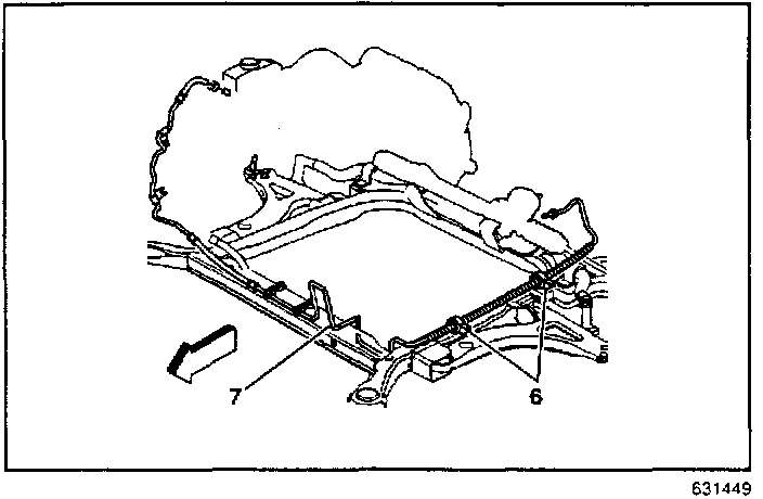 25. On the rearward side of the front engine frame crossmember, drill one 5 mm (0.2 in) hole using the attached LH retaining clip (6) as a template.