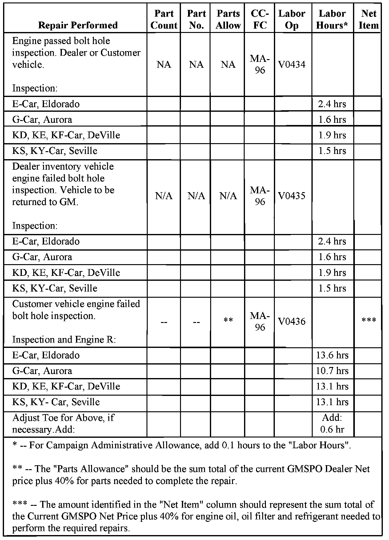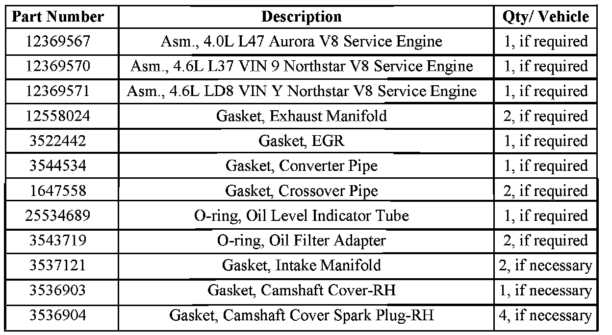 Involved are certain 1999 Oldsmobile Aurora model vehicles equipped with 4.0L engine (RPO L47, VIN C) and Cadillac Seville, DeVille and Eldorado model vehicles equipped with 4.6L engine (RPO LD8, VIN Y and RPO L37, VIN 9), and built within the VIN breakpoints shown