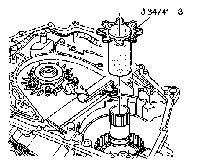 2. Install the J 34741-3 over the input shaft oil seal rings. Use a twisting motion to install the sizer. The sizer must contact the third clutch housing hub.