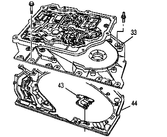 3. Install the new island gasket (43) and the new case cover gasket (44) over the dowel pins on the case. Pass the wiring harness through the large opening at the top of the case cover gasket. Make sure that the wiring harness remains under the gasket, except for the portion where the connectors are attached.