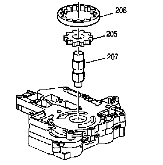 3. Remove the oil pump drive shaft (207), and the secondary pump gears (205, 206).