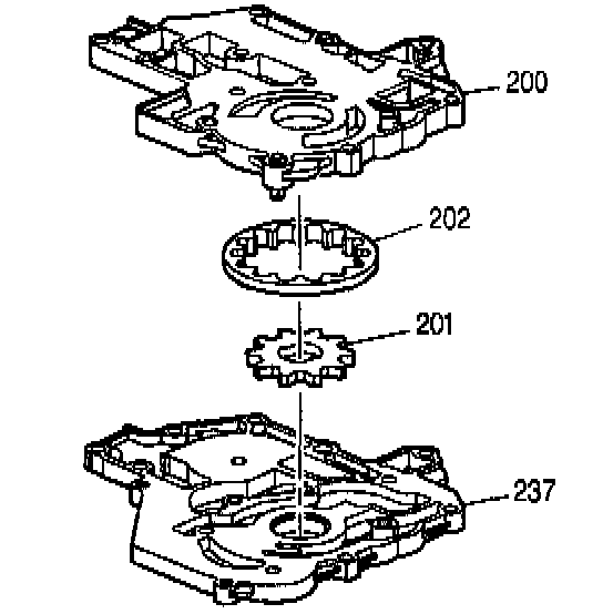 7. Remove the primary pump gears (201, 202).