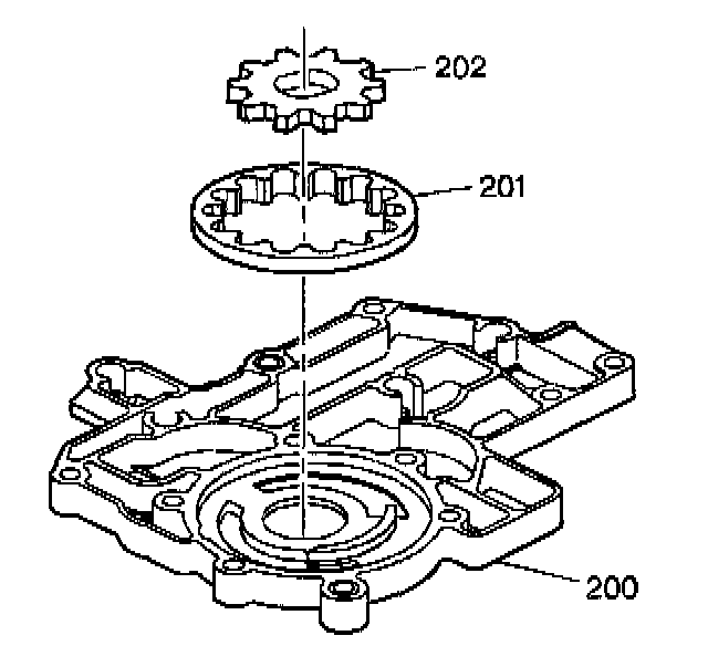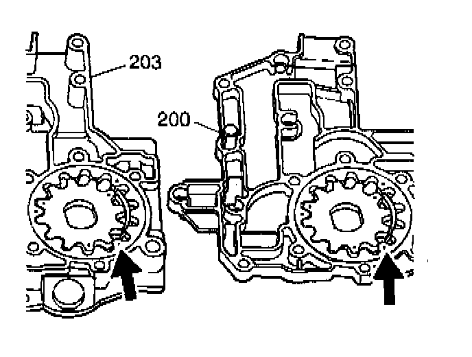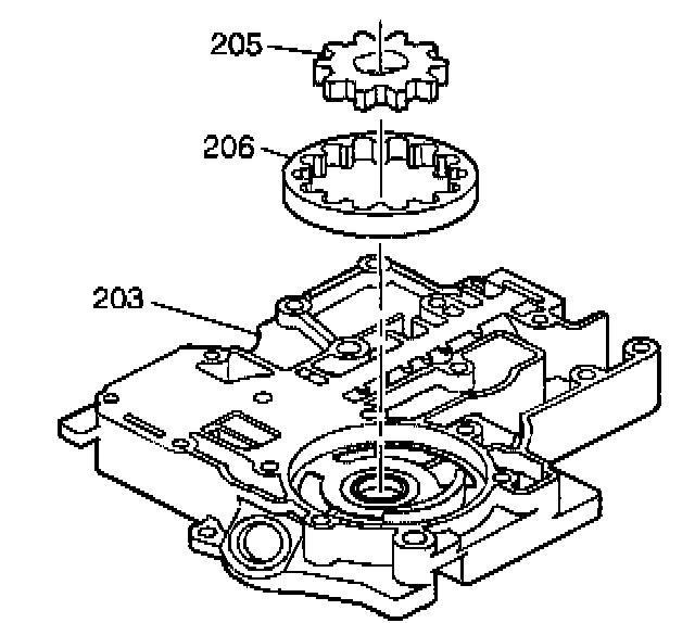 3. Inspect the pump gears (201, 202, 205, 206). These gears must be installed with the dimples facing up.
