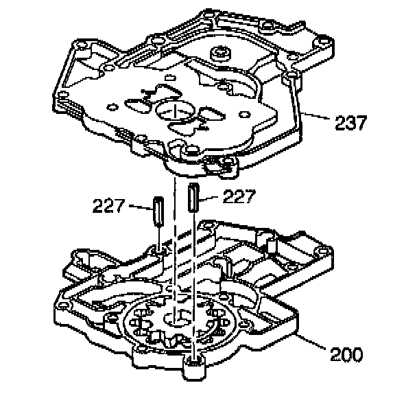 4. Install the scavenge pump cover (237) onto the primary pump body (200) over the dowel bushings (227). Tap the dowels in place to that they stick out of both the primary pump body and the scavenge cover.