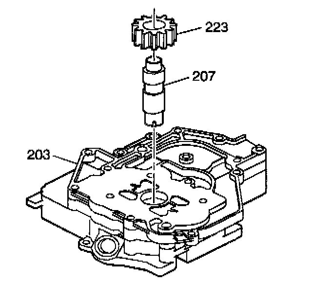 6. Install the oil pump driven shaft (207) into the pump assembly. The end of the shaft with the four notches is located in the secondary pump.