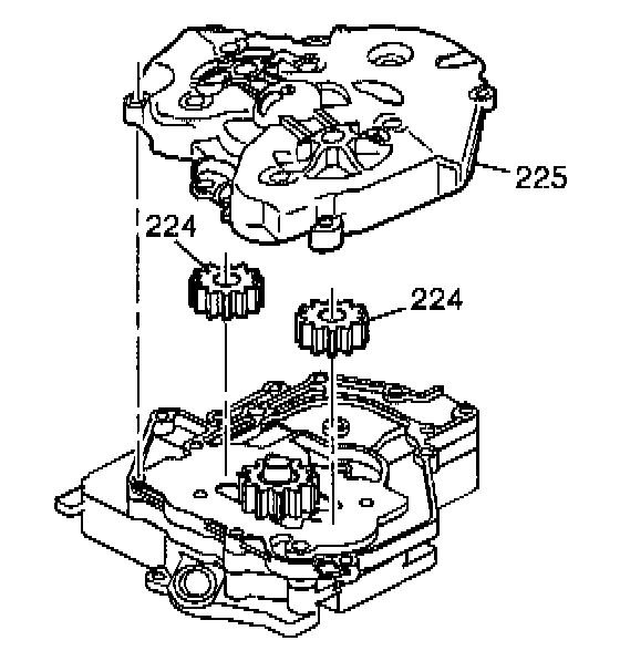 8. Align the scavenge pump driven gears (224) next to the drive gear (223). Install the scavenge pump body (225) onto the scavenge pump cover. Locate the scavenge pump driven gear pins into the scavenge pump driven gears (224). Press firmly into position.