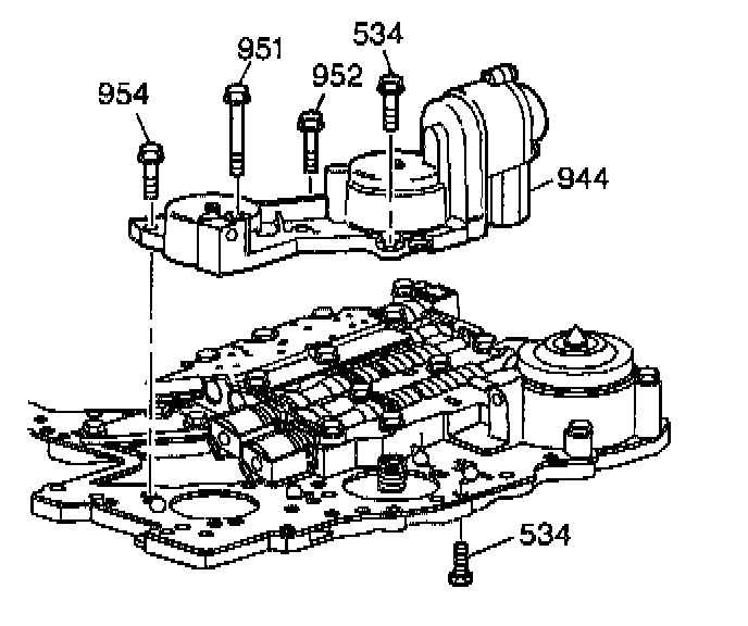 2. Remove the six 10-mm bolts (534, 951, 952, 954) from the accumulator housing. Then remove the accumulator housing (944) from the channel plate.