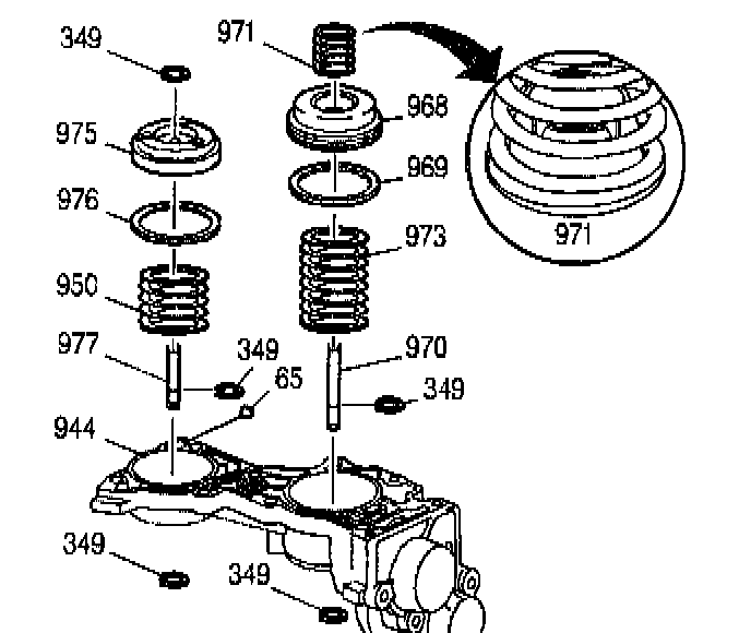 1. Remove the following parts: The two snap rings (349) from the top side of the accumulator housing (944) The 1-2 accumulator assembly (968-970, 973) The 3-4 accumulator assembly (975-977, 950)