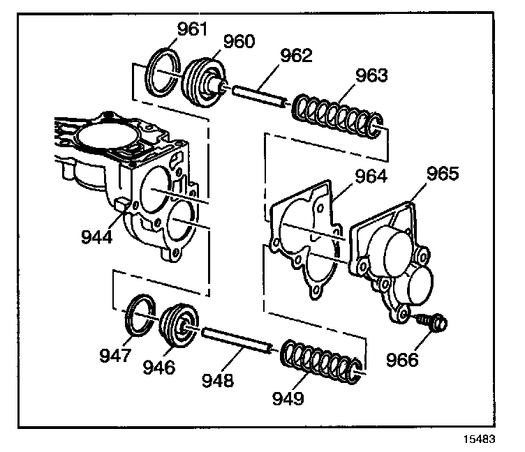 4. Inspect the accumulator pistons (946, 960) and the accumulator piston pins (948, 962) for scoring or damage.
