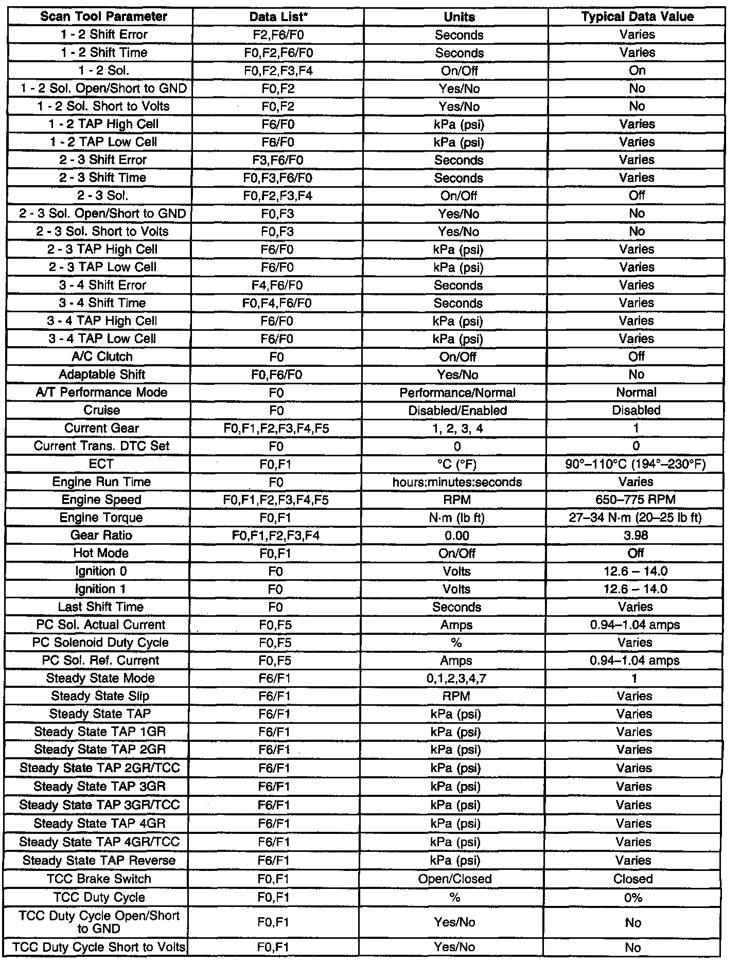Only the parameters listed below are used in this manual for diagnosing. If a scan tool displays other parameters, the values are not recommended by General Motors for use in diagnosis. Scan tool values below were recorded under the following conditions: