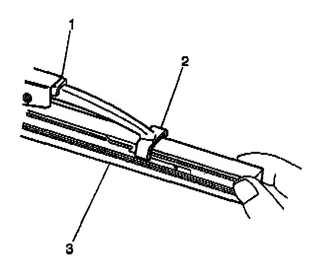 3. Engage the bottom claw (2) of the wiper blade (1) into the notches in wiper blade element (3).