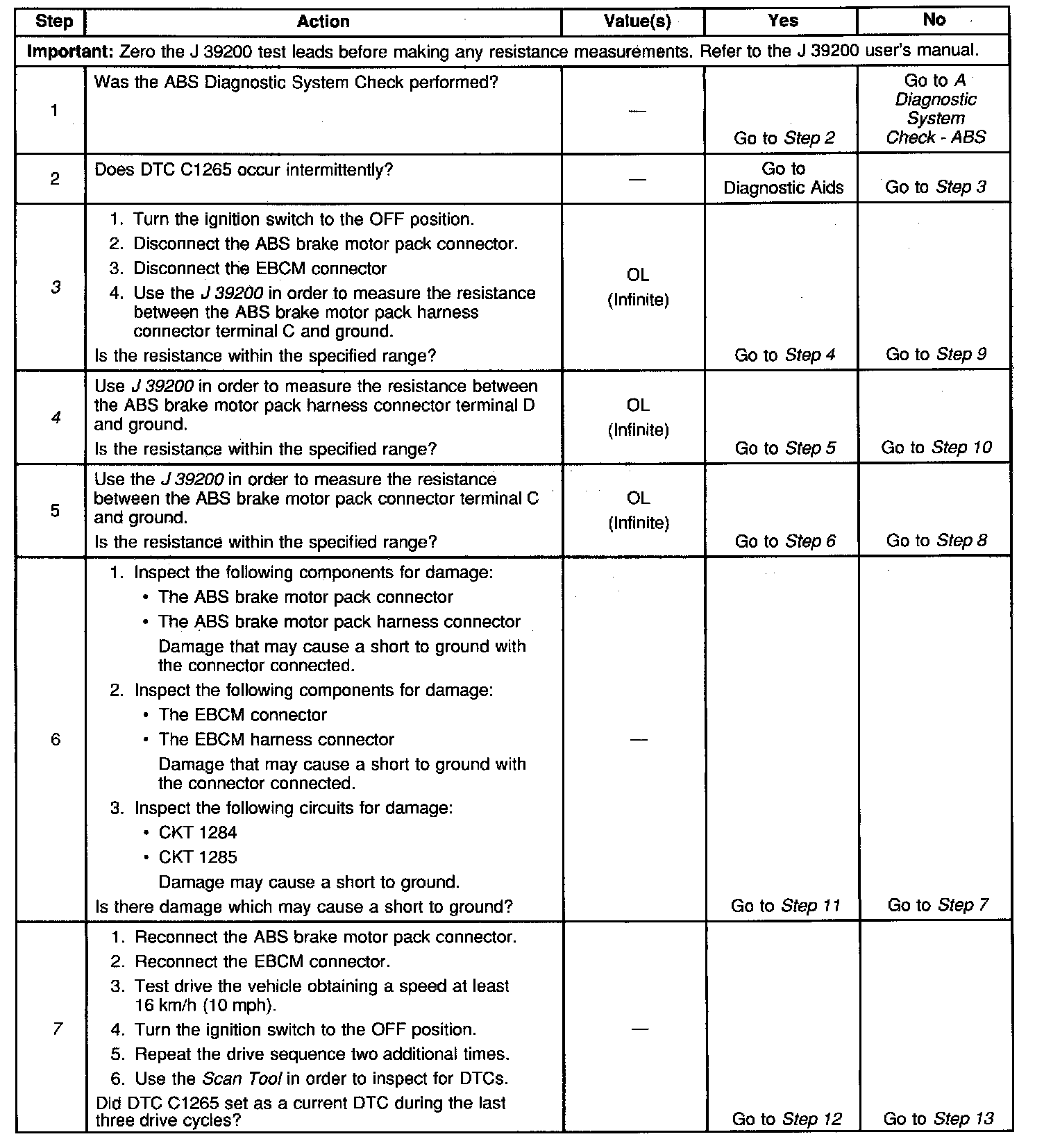 DTC C1265 identifies an ABS motor circuit that shorts to ground. The malfunction will cause one of the following conditions to occur: