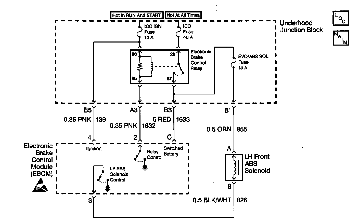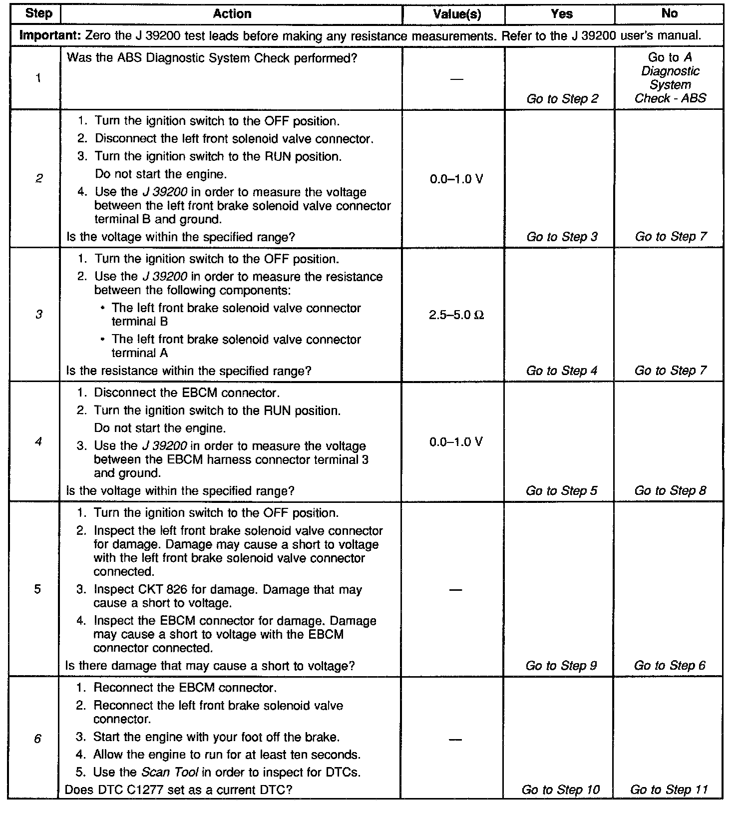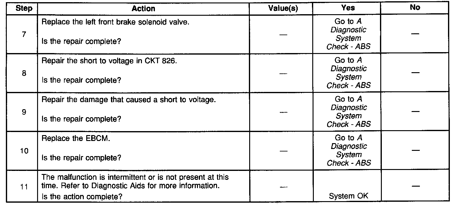 A malfunction exists if the EBCM detects the left front brake solenoid valve control circuit voltage is not within specifications.