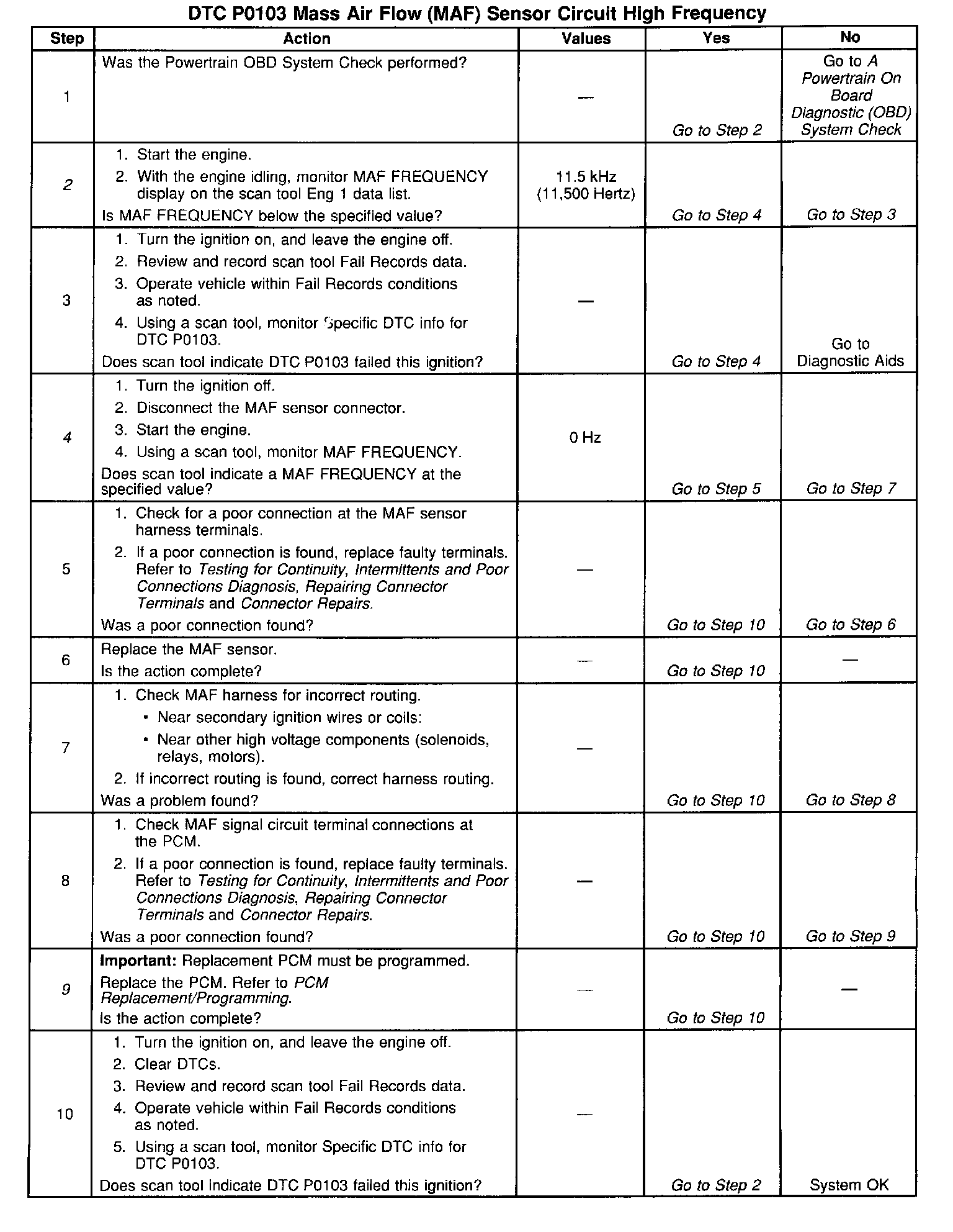 The MAF sensor produces a frequency signal which can be monitored using a scan tool. The frequency will vary within a range of around 2000 Hertz at idle to near 8,000 Hertz at maximum engine load. DTC P0103 will be set if the signal from the MAF sensor is above the possible range of a normally operating MAF sensor.