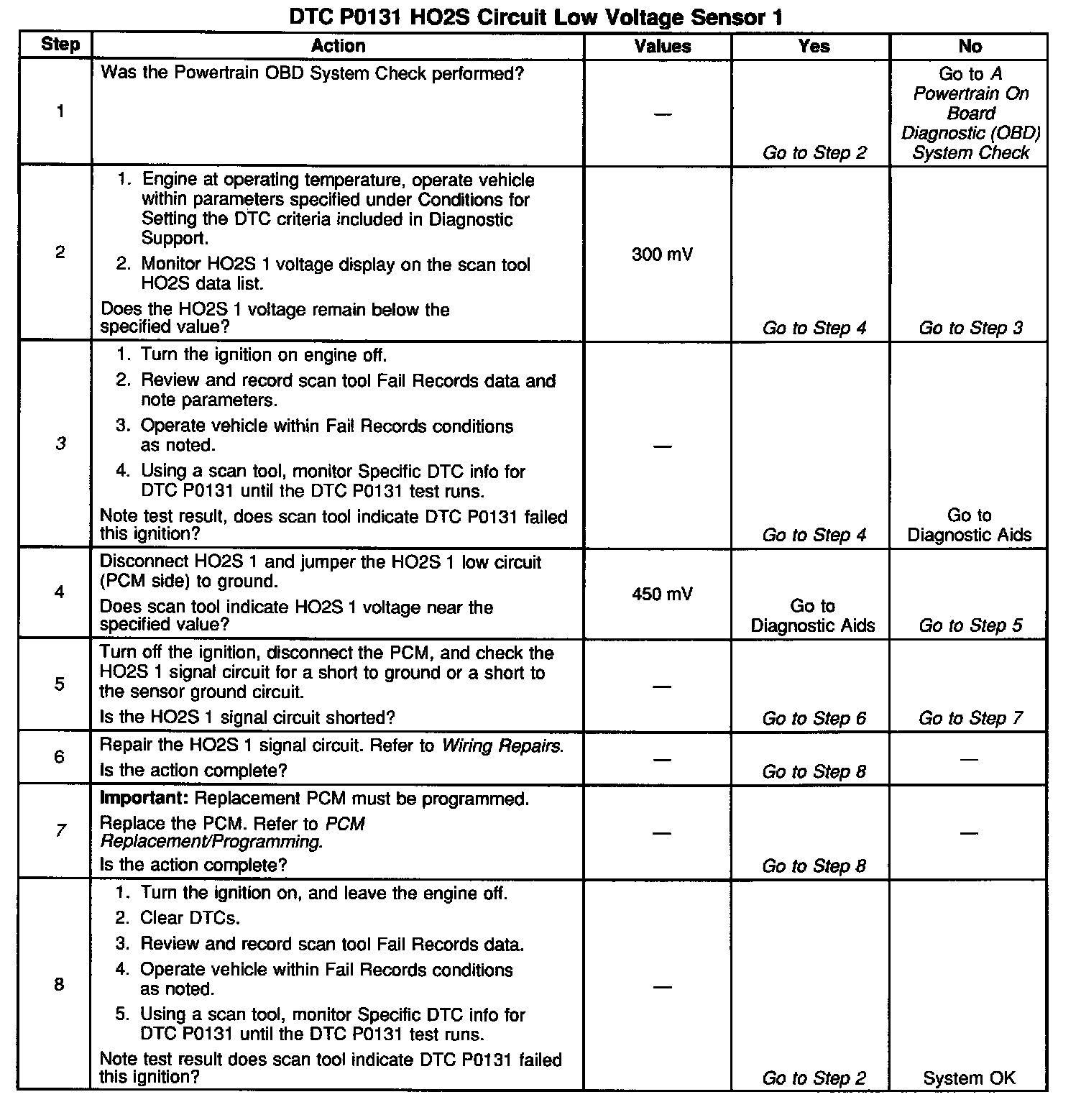 3. DTC P0131 failing during power enrichment operation may indicate a condition described in the Diagnostic Aids above. If the DTC P0131 test passes while the Fail Records conditions are being duplicated, an intermittent condition is indicated. Reviewing the Fail Records vehicle mileage since the diagnostic test last failed may help determine how often the condition that caused the DTC to be set occurs. This may assist in diagnosing the condition.