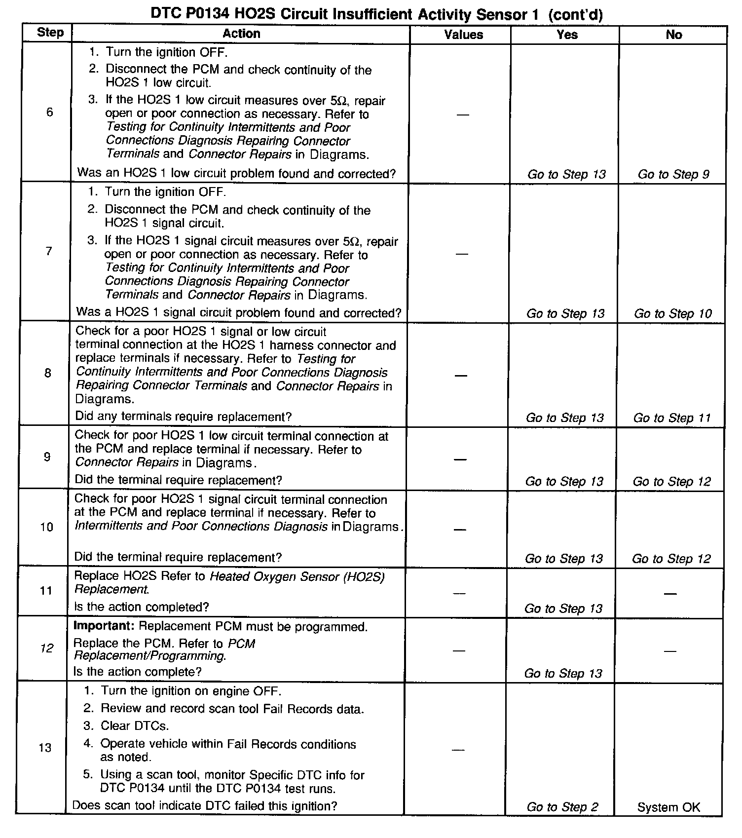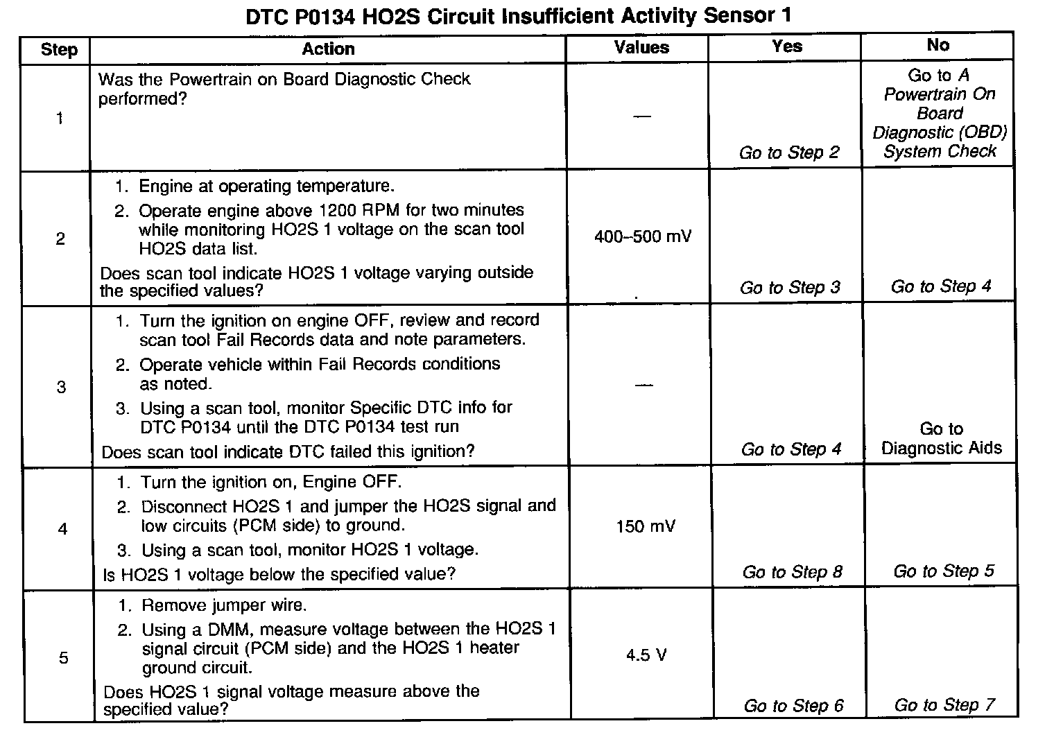 The PCM supplies a bias voltage of about 450 mV between the HO2S signal and low circuits. When measured with a 10 megaohm digital voltmeter, this may display as low as 320 mV. The Oxygen Sensor varies the voltage within a range of about 1000 mV when the exhaust is rich, down through about 10 mV when exhaust is lean. The PCM constantly monitors the HO2S signal during closed loop operation and compensates for a rich or lean condition by decreasing or increasing injector pulse width as necessary. If the HO2S 1 voltage remains at or near the 450 mV bias for an extended period of time, DTC P0134 will be set, indicating an open sensor signal or sensor low circuit.