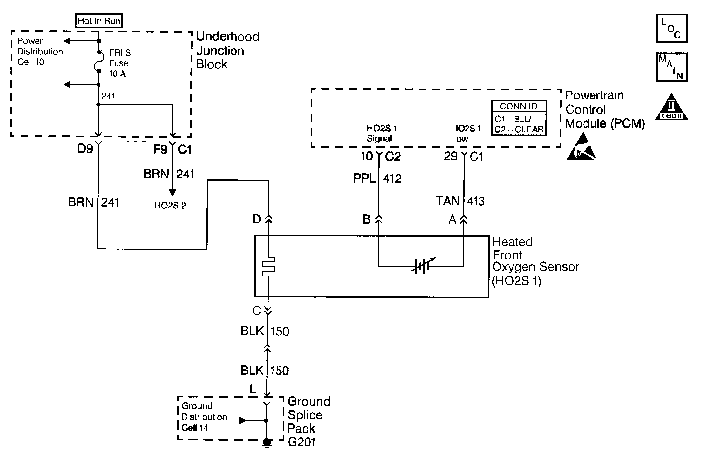 ^ Faulty HO2S heater or heater circuit. With the ignition ON, engine OFF, the HO2S voltage displayed on a scan tool should gradually drop to below 250 mV or rise to above 600 mV. If not, disconnect the HO2S and connect a test light between the HO2S ignition feed and heater ground circuits. If the test light does not light, repair the open ignition feed or sensor ground circuit as necessary. If the test light lights and the HO2S signal and low circuits are OK, replace the HO2S.