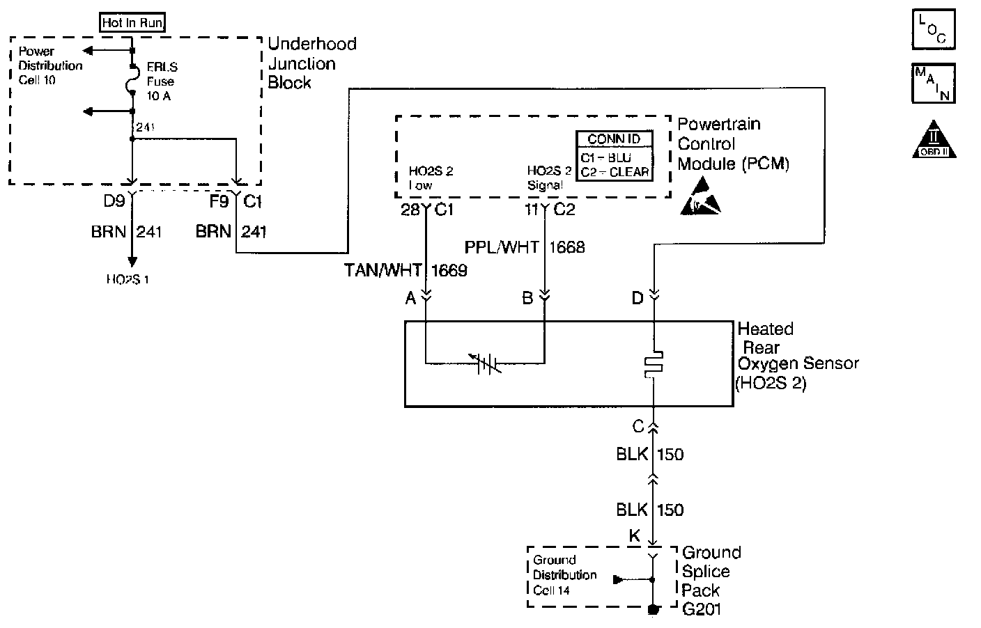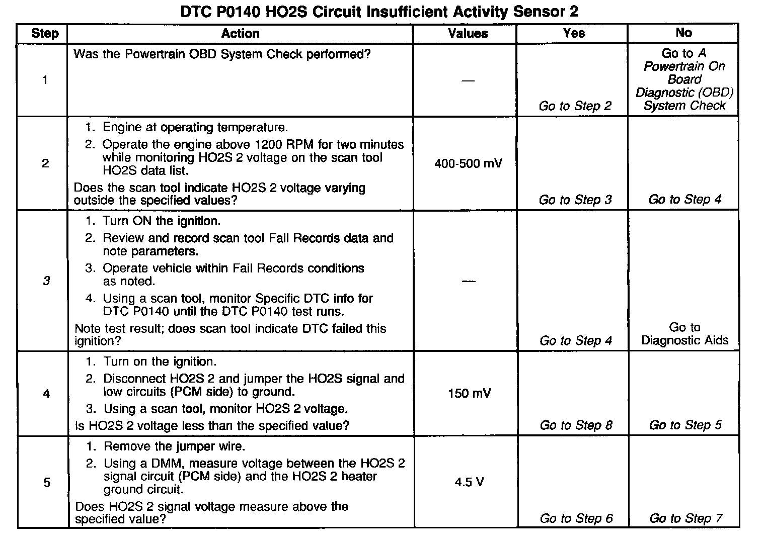 ^ Malfunctioning HO2S heater or heater circuit. With the ignition ON, engine not running the HO2S voltage displayed on a scan tool should gradually drop to below 250 mV or rise to above 600 mV. If not, disconnect the HO2S and connect a test light between the HO2S ignition feed and heater ground circuits. If the test light does not light, repair the open ignition feed or sensor ground circuit as necessary. If the test light lights and the HO2S signal and low circuits are OK, replace the affected HO2S. Refer to Heated Oxygen Sensor (HO2S) Replacement.