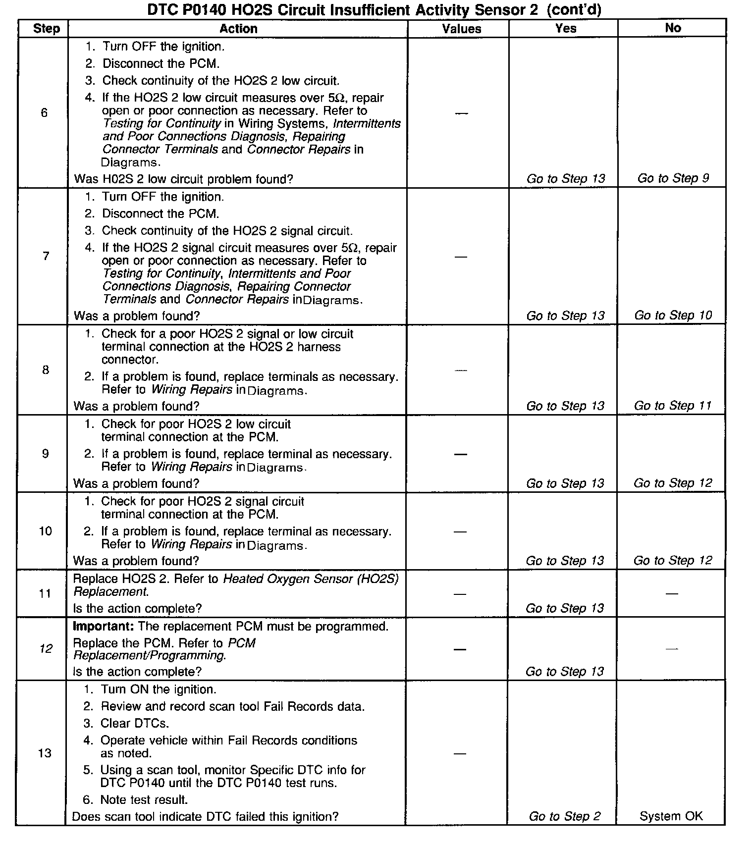 To control emissions of Hydrocarbons (HC), Carbon Monoxide (CO), and Oxides of Nitrogen (NOx), a three way catalytic converter is used. The catalyst within the converter promotes a chemical reaction which oxidizes the HC and CO present in the exhaust gas, converting them into harmless water vapor and carbon dioxide. The catalyst also reduces NOx, converting it to nitrogen. The PCM has the ability to monitor this process using the HO2S 1 and the HO2S 2 heated Oxygen Sensors. The HO2S 1 sensor produces an output signal which indicates the amount of oxygen present in the exhaust gas entering the three way catalytic converter. The HO2S 2 sensor produces an output signal which indicates the oxygen storage capacity of the catalyst this in turn indicates the catalysts ability to convert exhaust gases efficiently. If the catalyst is operating efficiently, the HO2S 1 signal will be far more active than that produced by the HO2S 2 sensor. If the HO2S 2 signal voltage remains at or near the 450 mV bias for an extended period of time, DTC P0140 will be set.