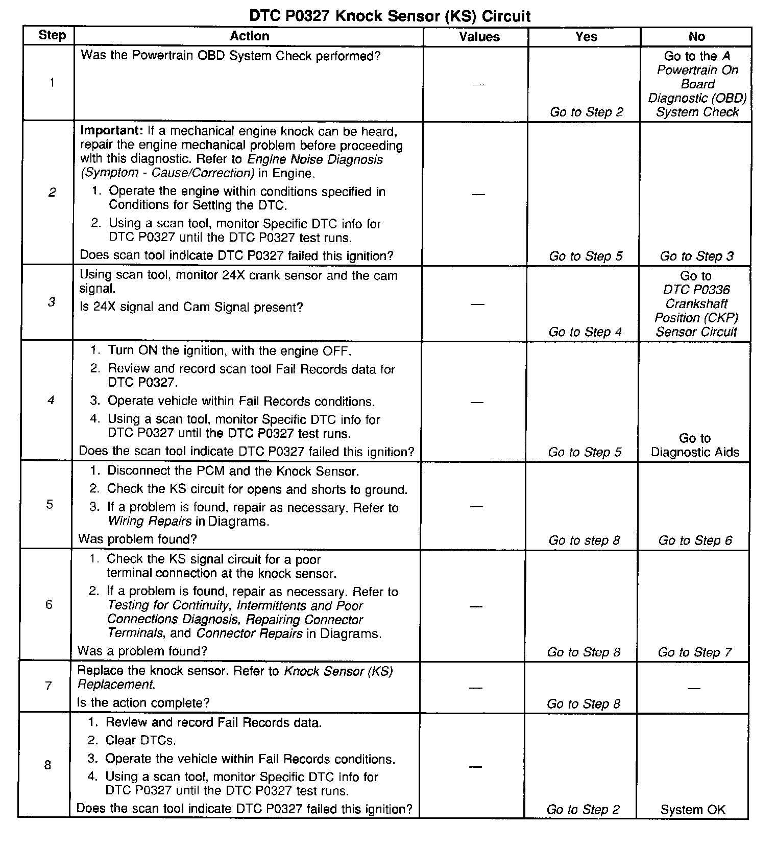 3. If both the 24X Crank Sensor and the Cam signal are not present the KS signal will stop updating and set DTC P0327. The ignition positive voltage supply and the ground circuits need to be diagnosed using the DTC P0336.