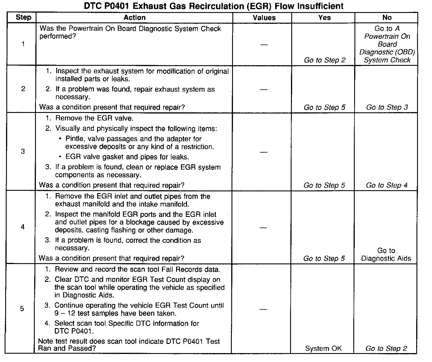 The PCM tests the EGR system during deceleration by momentarily commanding the EGR valve to open while monitoring the Manifold Absolute Pressure (MAP) sensor signal. When the EGR valve is opened, the PCM should see a proportional increase in MAP. If the expected increase in MAP is not seen, the PCM notes the amount of error that was detected and adjusts an internal fail counter towards a fail threshold level. When the fail counter exceeds the fail threshold level, the PCM will set DTC P0401. The number of test samples required to accomplish this may vary according to the amount of detected flow error.