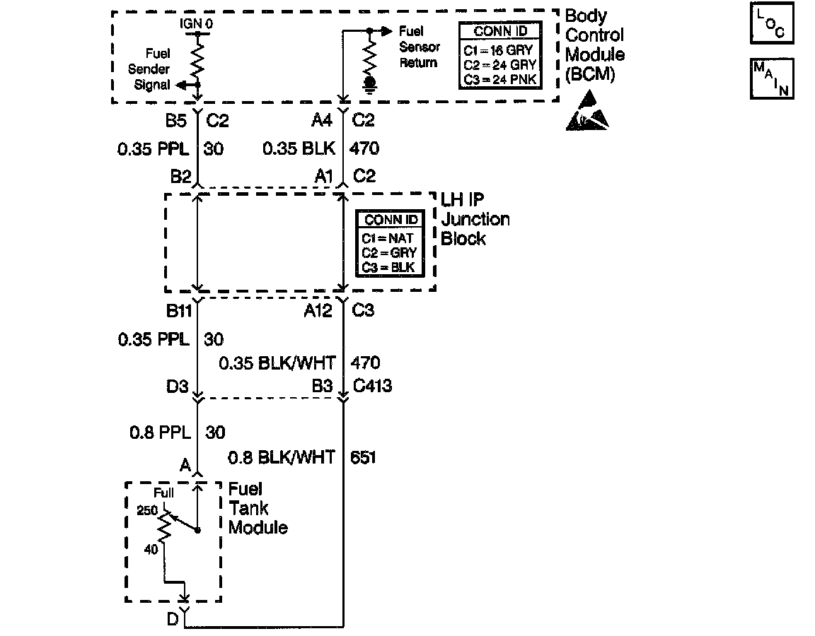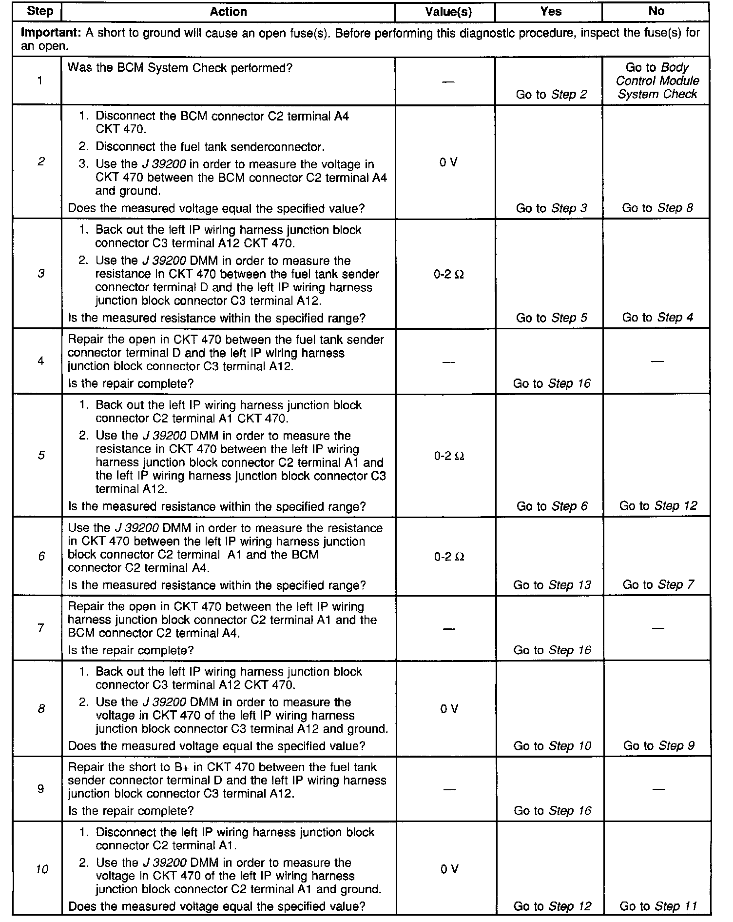 3. This step determines if there is an open in CKT 470 between the fuel tank module and the left IP wiring harness junction block.