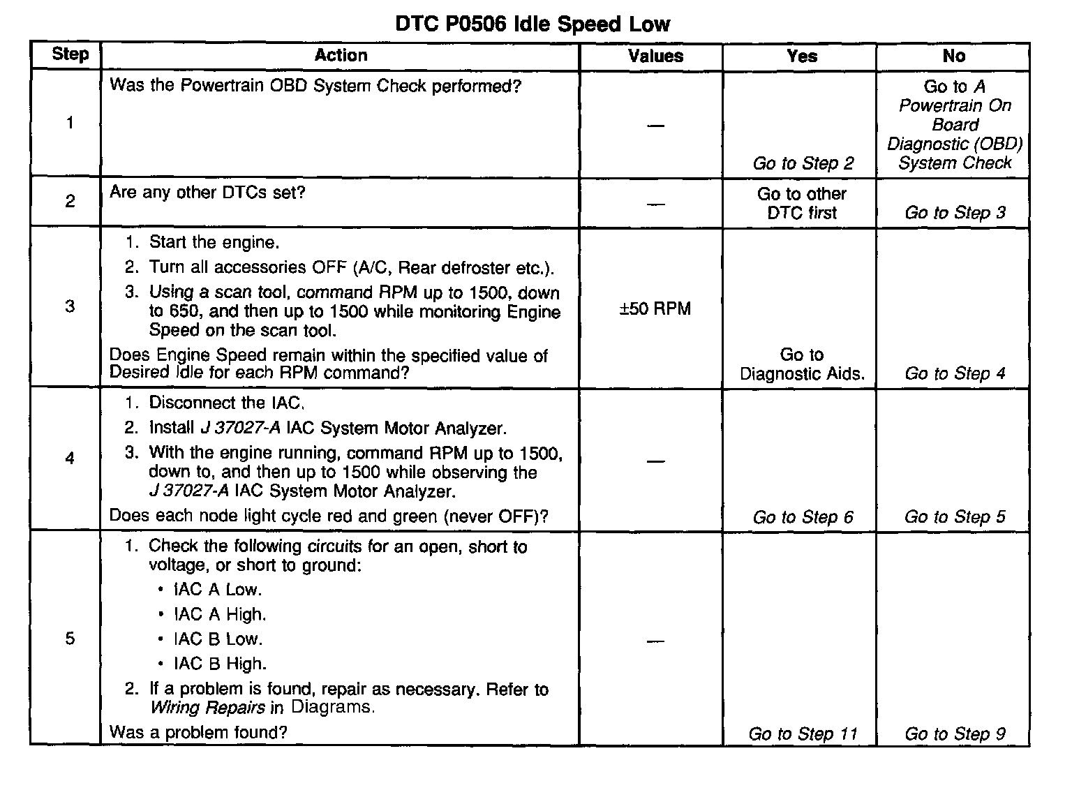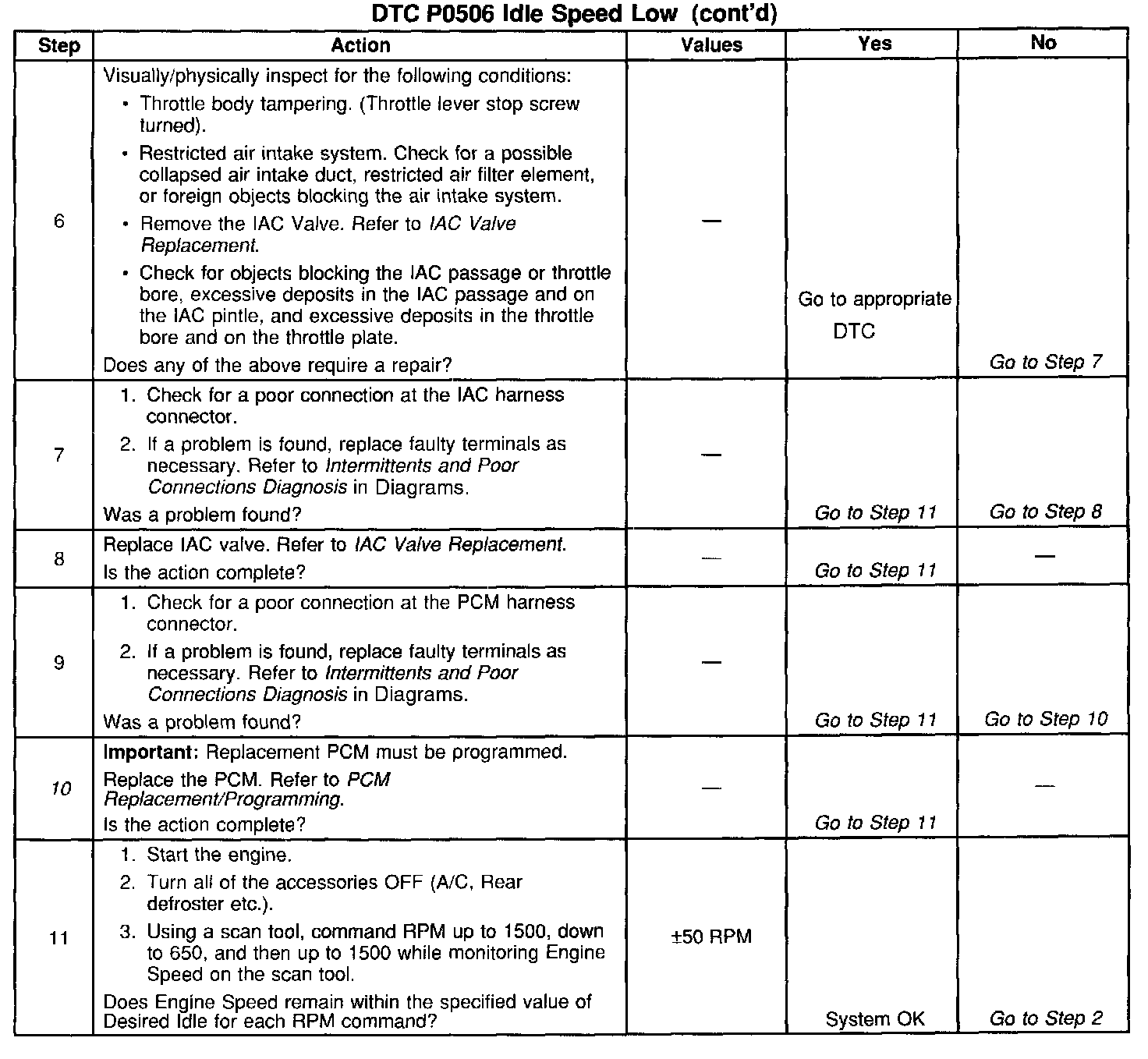 The PCM controls engine idle speed by adjusting the position of the Idle Air Control (IAC) motor pintle. The IAC is a bi-directional motor driven by two coils. The PCM applies current to the AC coils in pulses (counts) to extend the IAC pintle into a passage in the throttle body to decrease air flow. The PCM reverses the current to retract the pintle, increasing air flow. This method allows highly accurate control of idle speed and quick response to changes in engine load. If the PCM detects a condition where too low of an idle speed is present and the PCM is unable to adjust idle speed by increasing the AC counts, DTC P0506 will set indicating a problem with the idle control system.