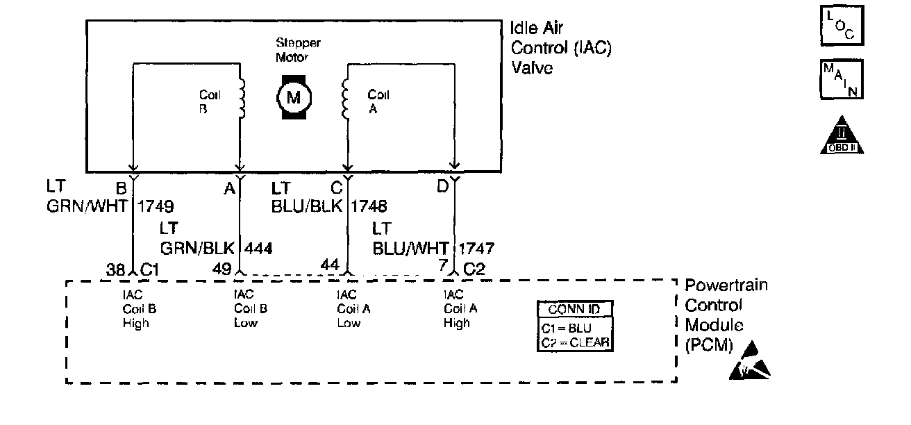 ^ Poor connection at PCM or IAC motor. Inspect harness connectors for backed out terminals, improper mating, broken locks, improperly formed or damaged terminals, and poor terminal to wire connection. Refer to Intermittents and Poor Connections.