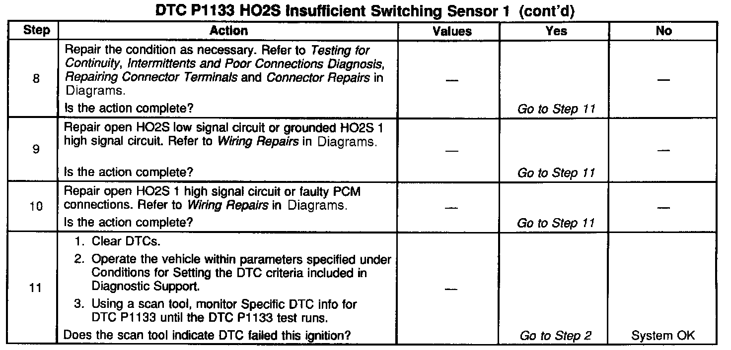 A malfunction in the HO2S heater ignition feed or ground circuit may cause a DTC P1133 to set. Check HO2S heater circuitry for intermittent faults or poor connections. If connections and wiring are OK and DTC P1133 continues to set, replace the HO2S 1.