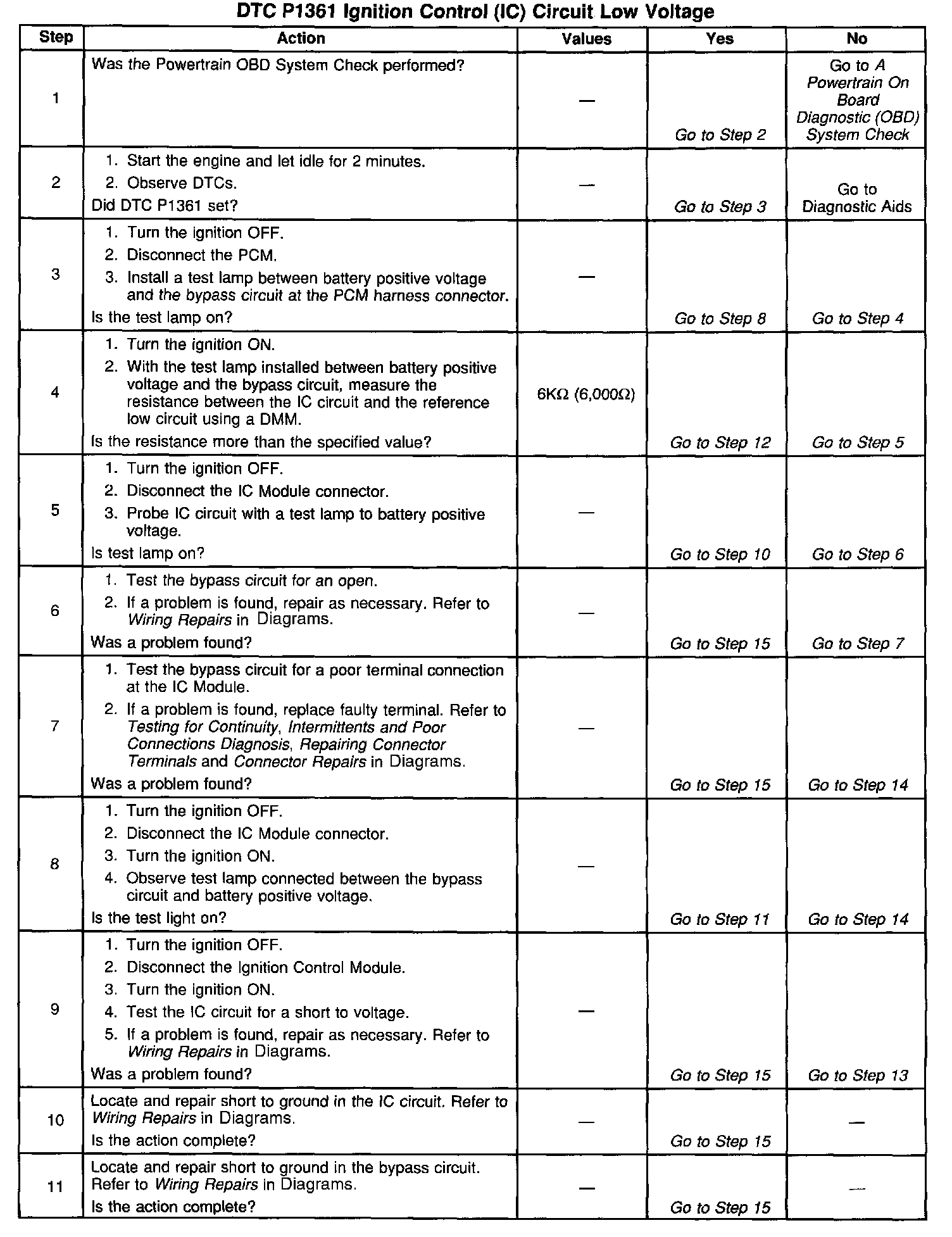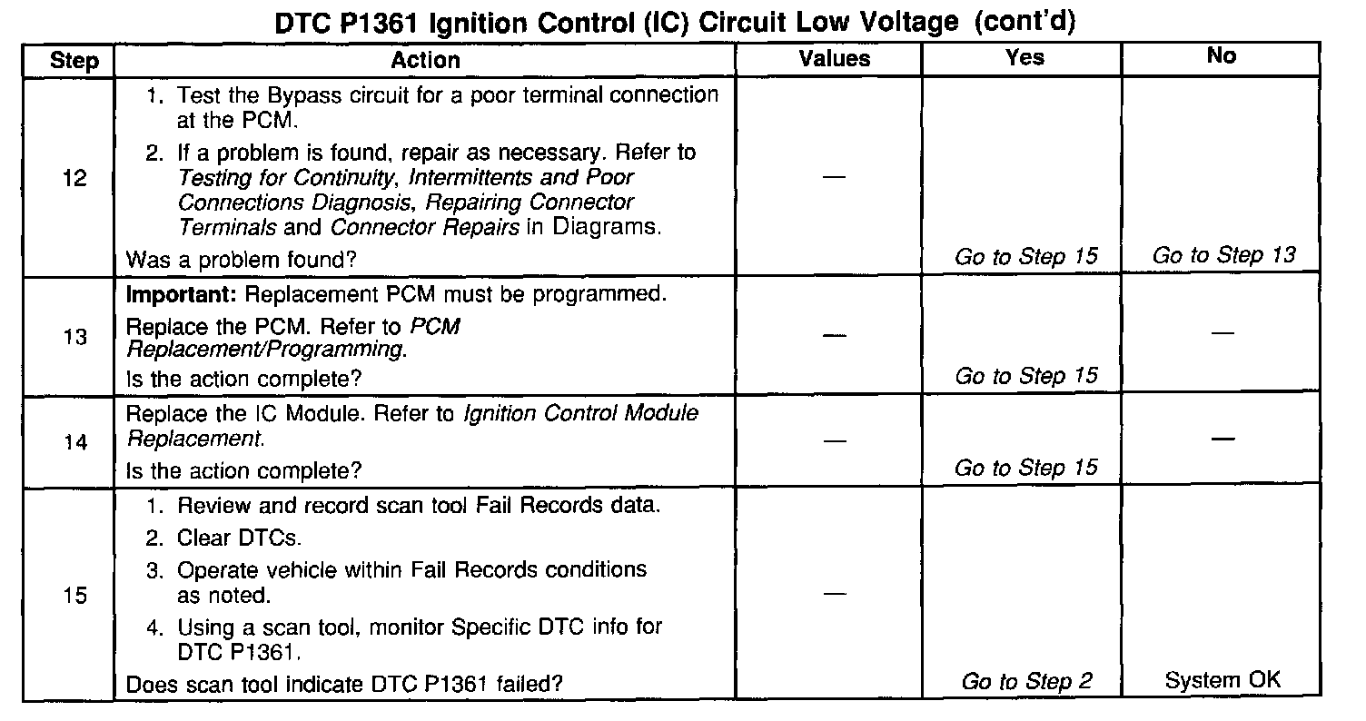The ignition Control (IC) Module sends signals that the PCM requires for fuel control and spark advance calculations. At the start of engine crank the IC Module controls spark advance. When the second 3X reference pulse is recognized by the PCM, the PCM applies 5.0 volts to the Bypass circuit. The 5 volts on the Bypass circuit commands the IC Module to switch spark advance to PCM control. At this time, the IC Module will remove the ground it has applied to the IC circuit. When the IC pulses are not grounded, the IC Module can use the IC pulses to control spark advance. A short in the IC circuit or an open or short to ground in the Bypass circuit will cause the PCM to set DTC P1361. The engine may be started but will run with the ICM controlling spark timing.